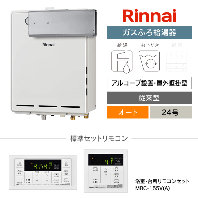 【工事費込み】RUF-A2405SAA(C)|リンナイ ガスふろ給湯器|アルコーブ設置・屋外壁掛型|24号|オート