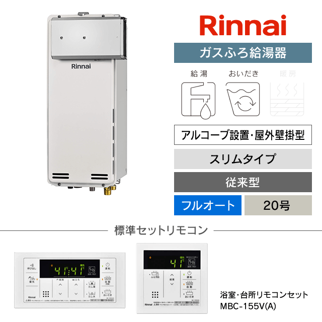 【工事費込み】RUF-SA2005AA(A)|リンナイ ガスふろ給湯器|アルコーブ設置・屋外壁掛型|スリムタイプ|20号|フルオート