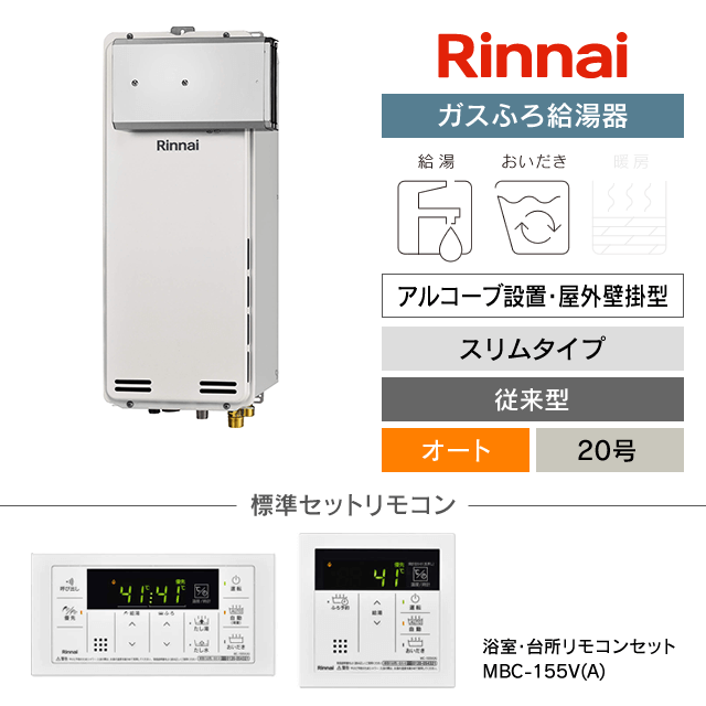 【工事費込み】RUF-SA2005SAA(A)|リンナイ ガスふろ給湯器|アルコーブ設置・屋外壁掛型|スリムタイプ|20号|オート
