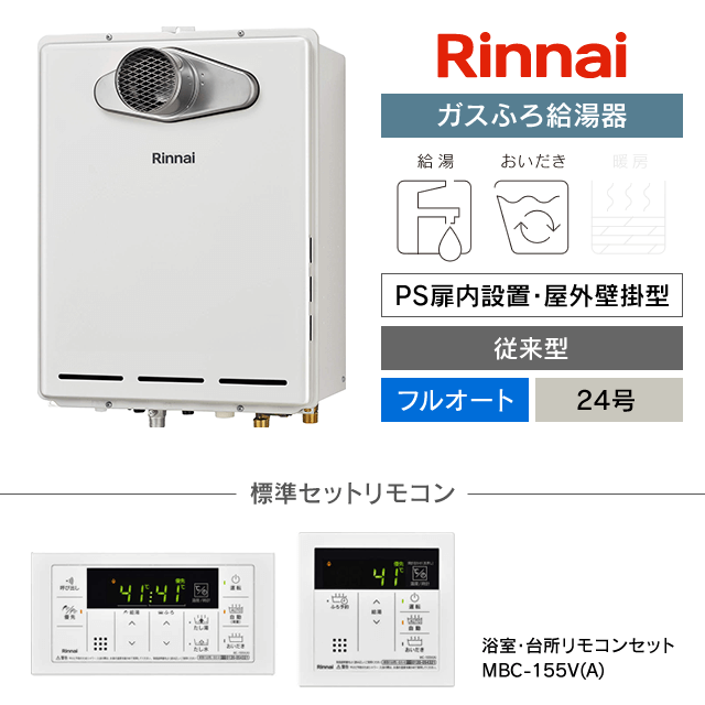 【工事費込み】RUF-A2405AT-L(C)|リンナイ ガスふろ給湯器|PS扉内設置・屋外壁掛型|24号|フルオート
