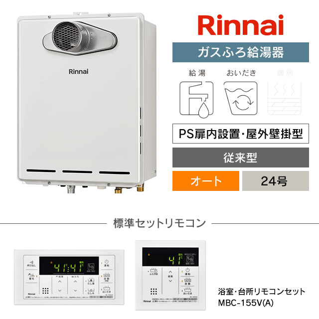 【工事費込み】RUF-A2405SAT-L(C)|リンナイ ガスふろ給湯器|PS扉内設置・屋外壁掛型|24号|オート