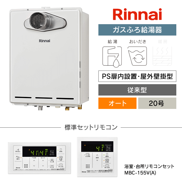 【工事費込み】RUF-A2005SAT(C)|リンナイ ガスふろ給湯器|PS扉内設置・屋外壁掛型|20号|オート