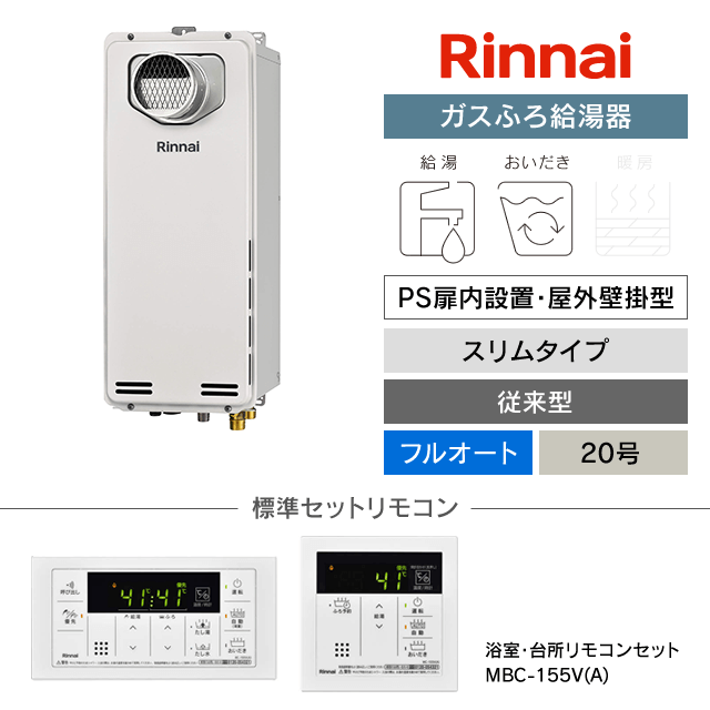 【工事費込み】RUF-SA2005AT(A)|リンナイ ガスふろ給湯器|PS扉内設置・屋外壁掛型|スリムタイプ|20号|フルオート