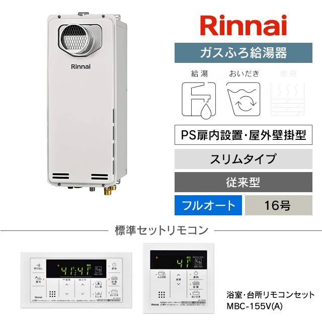 【工事費込み】RUF-SA1615AT(A)|リンナイ ガスふろ給湯器|PS扉内設置・屋外壁掛型|スリムタイプ|16号|フルオート