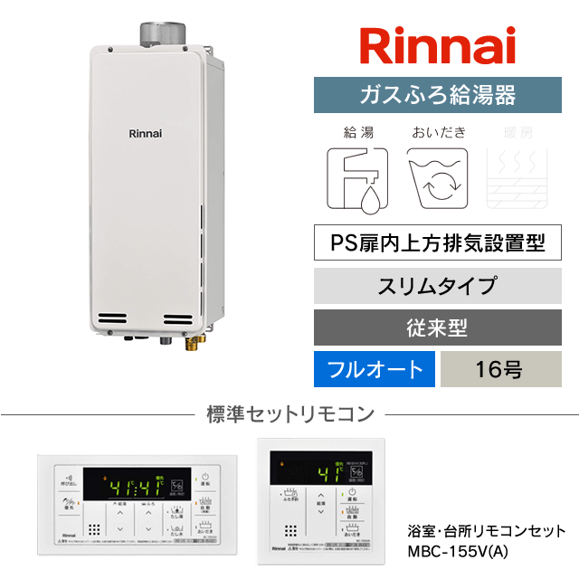 【工事費込み】RUF-SA1615AU(A)|リンナイ ガスふろ給湯器|PS扉内上方排気設置型|スリムタイプ|16号|フルオート
