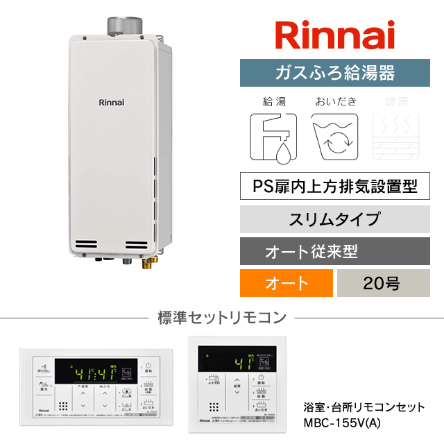 【工事費込み】RUF-SA2005SAU(A)|リンナイ ガスふろ給湯器|PS扉内上方排気設置型|スリムタイプ|20号|オート