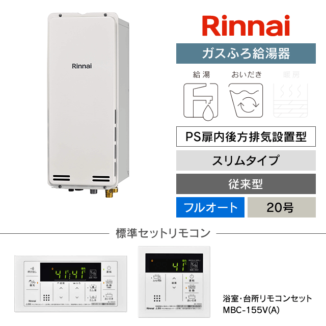 【工事費込み】RUF-SA2005AB(A)|リンナイ ガスふろ給湯器|PS扉内後方排気設置型|スリムタイプ|20号|フルオート