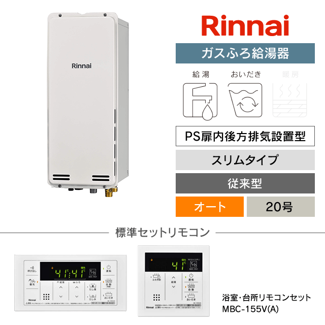 【工事費込み】RUF-SA2005SAB(A)|リンナイ ガスふろ給湯器|PS扉内後方排気設置型|スリムタイプ|20号|オート
