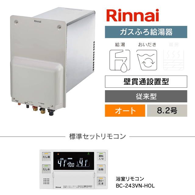 【工事費込み】RUF-HA83SA-E|リンナイ ガスふろ給湯器|壁貫通型|8.2号|オート