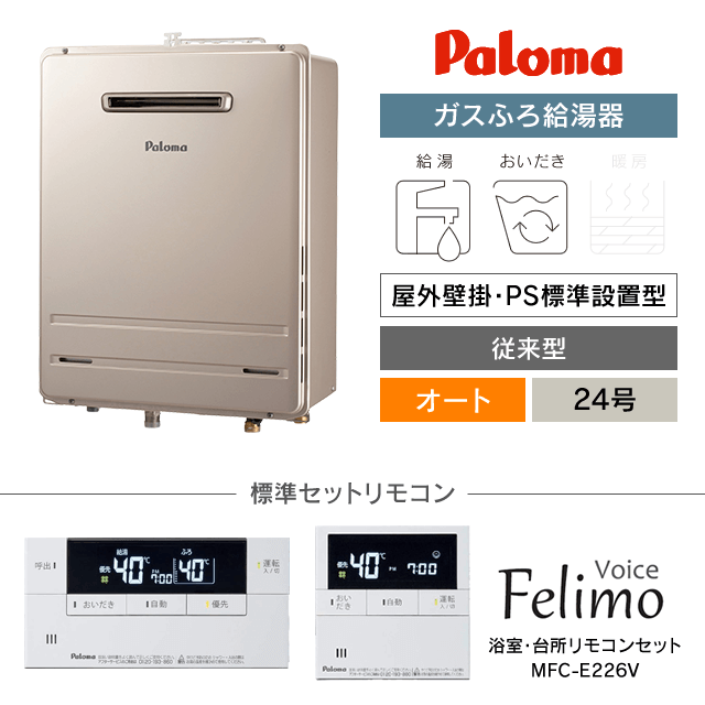 【工事費込み】FH-2423SAW-1|パロマ ガスふろ給湯器|屋外壁掛・PS標準設置型|24号|オート