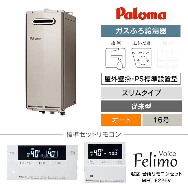 【工事費込み】FH-S1614SAW|パロマ ガスふろ給湯器|屋外壁掛・PS標準設置型|スリムタイプ|16号|オート