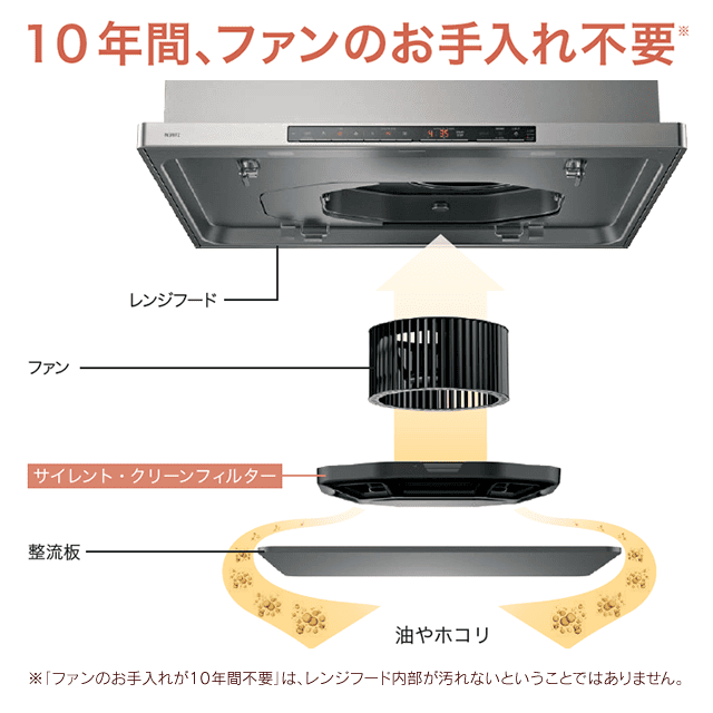 3層構造のサイレント・クリーンフィルターがほとんどの油やホコリをキャッチし、ファンのお手入れを10年間しなくても快適な換気を実現します。