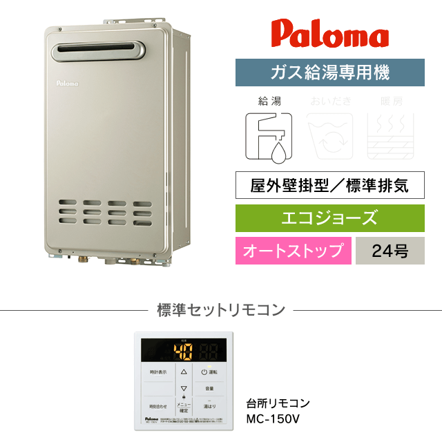 【工事費込み】PH-E2425AWL|パロマ ガス給湯専用機|エコジョーズ|屋外壁掛型|24号|オートストップ