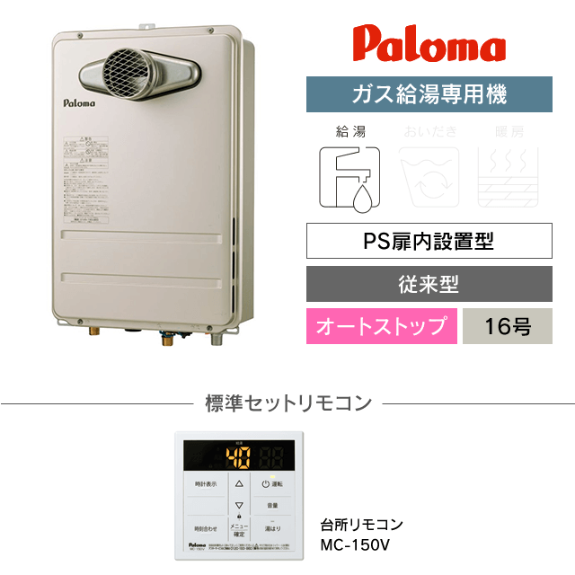 【工事費込み】PH-1615AT|パロマ ガス給湯専用機|PS扉内設置型|16号|オートストップ
