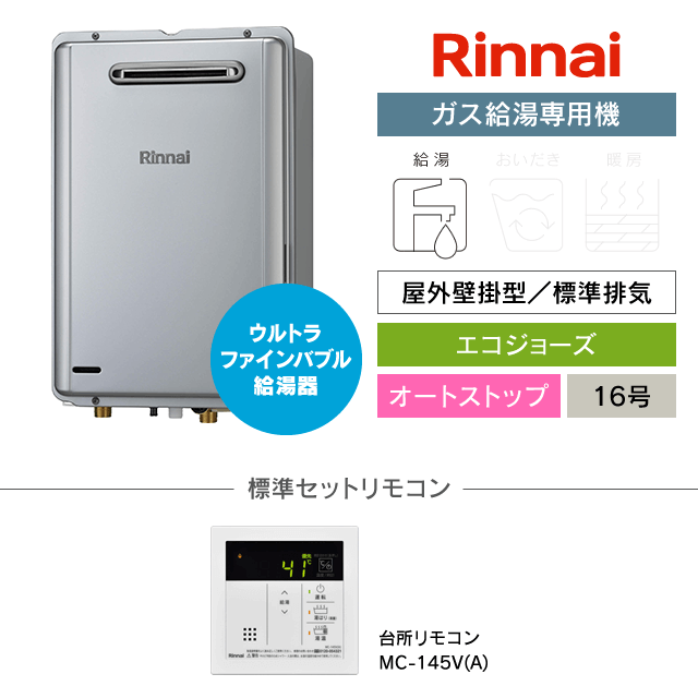 【工事費込み】RUX-UE1616W(A)|リンナイ ガス給湯専用機|ウルトラファインバブル給湯器|エコジョーズ|屋外壁掛型|16号|オートストップ
