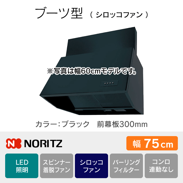 【工事費込み】NFG7B07BA[幅75cm][前幕板300mm]レンジフード ノーリツ《ブーツ型/シロッコファン》