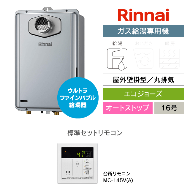 【工事費込み】RUX-UE1616T(A)|リンナイ ガス給湯専用機|ウルトラファインバブル給湯器|エコジョーズ|屋外壁掛型/丸排気|16号|オートストップ