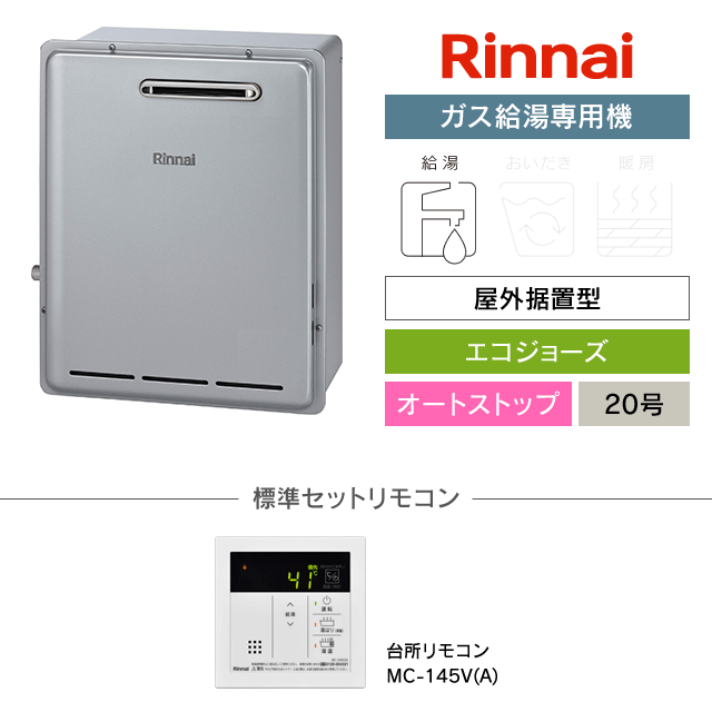 【工事費込み】RUX-E2016G(A)|リンナイ ガス給湯専用機|エコジョーズ|屋外据置型|20号|オートストップ