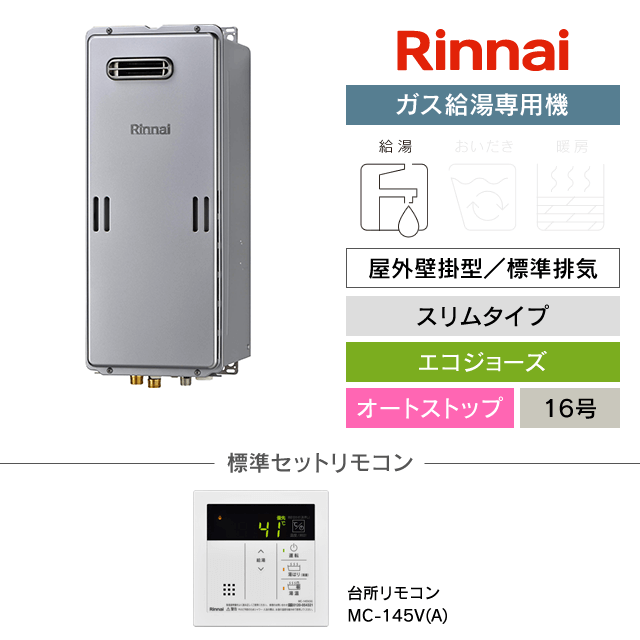 【工事費込み】RUX-SE1616W(A)|リンナイ ガス給湯専用機|エコジョーズ|屋外壁掛型|スリムタイプ|16号|オートストップ