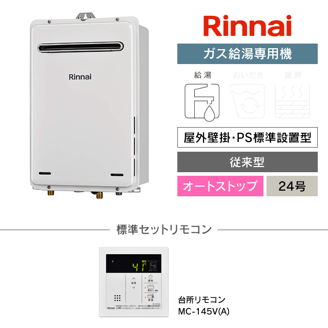 【工事費込み】RUX-A2406W(A)-E|リンナイ ガス給湯専用機|屋外壁掛・PS標準設置型|24号|オートストップ