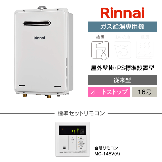 【工事費込み】RUX-A1616W(A)-E|リンナイ ガス給湯専用機|屋外壁掛・PS標準設置型|16号|オートストップ