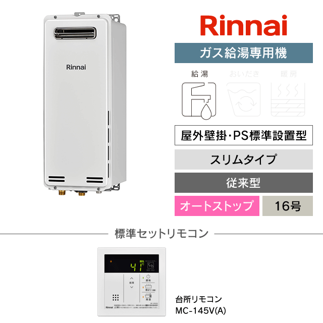 【工事費込み】RUX-SA1616W(A)-E|リンナイ ガス給湯専用機|屋外壁掛・PS標準設置型|スリムタイプ|16号|オートストップ