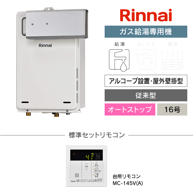 【工事費込み】RUX-A1616A(A)-E|リンナイ ガス給湯専用機|アルコーブ設置・屋外壁掛型|16号|オートストップ