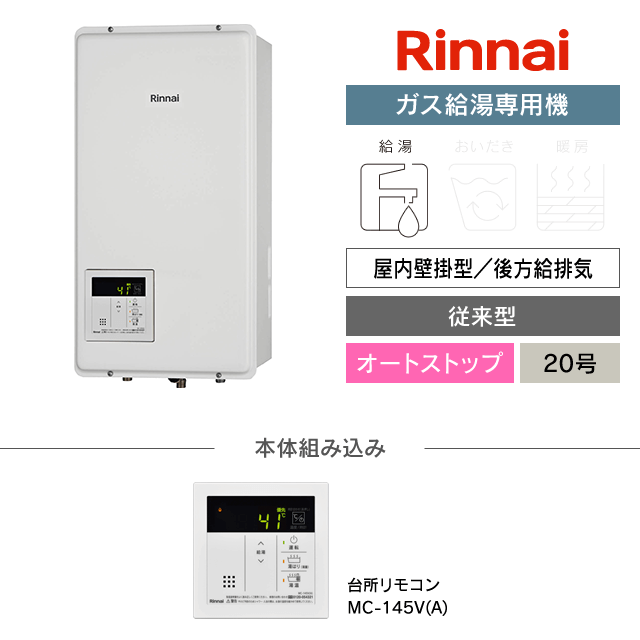 【工事費込み】RUX-V2015SFFBA(A)-E|リンナイ ガス給湯専用機|屋内壁掛型/後方給排気|20号|オートストップ