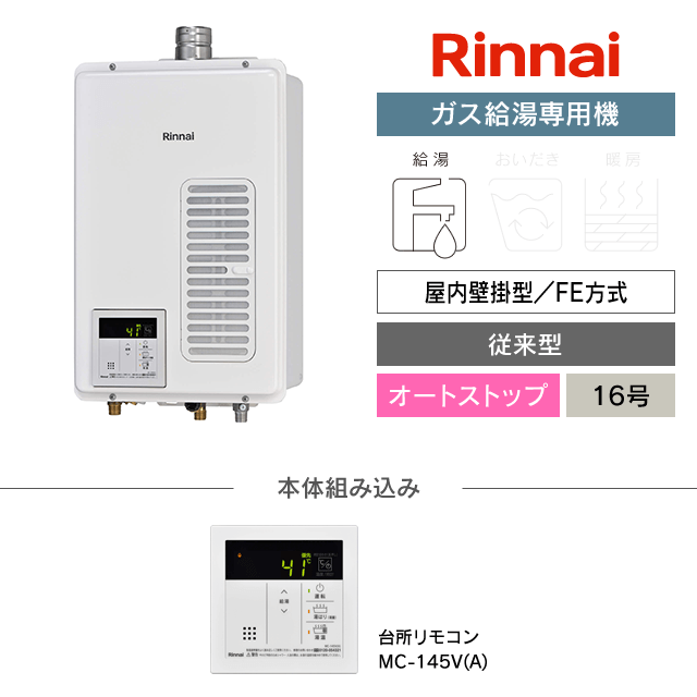 【工事費込み】RUX-V1615SWFA(B)-E|リンナイ ガス給湯専用機|屋内壁掛型/FE方式|16号|オートストップ