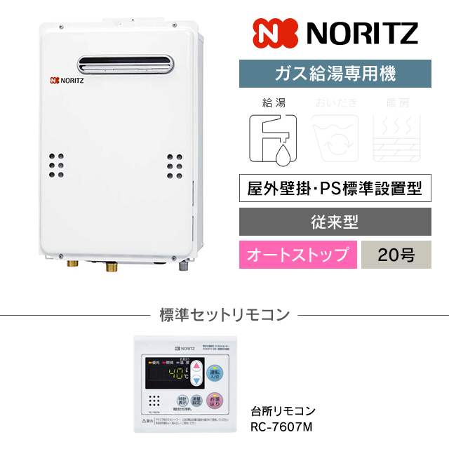【工事費込み】GQ-2039WS-1|ノーリツ ガス給湯専用機|屋外壁掛・PS標準設置型|20号|オートストップ