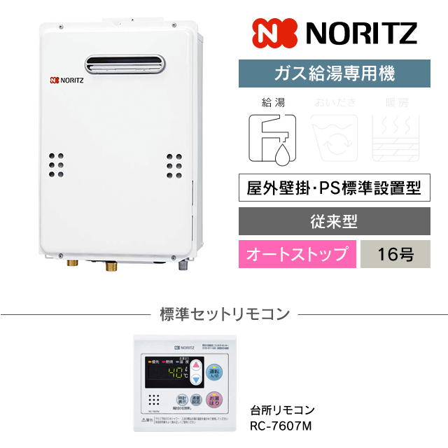 【工事費込み】GQ-1639WS-1|ノーリツ ガス給湯専用機|屋外壁掛・PS標準設置型|16号|オートストップ