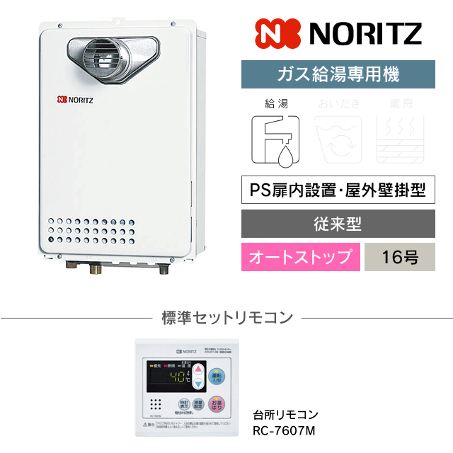 【工事費込み】GQ-1639WS-T-1|ノーリツ ガス給湯専用機|PS扉内設置・屋外壁掛型|16号|オートストップ