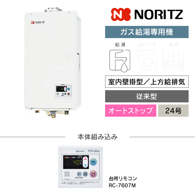 【工事費込み】GQ-2437WS-FFA|ノーリツ ガス給湯専用機|屋内壁掛型/上方給排気|24号|オートストップ
