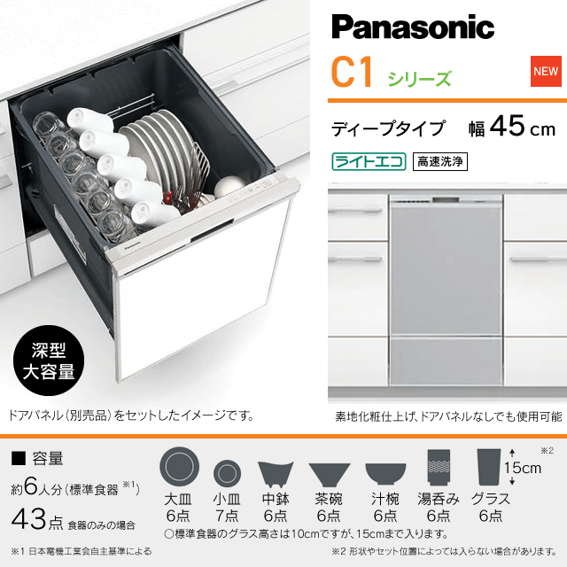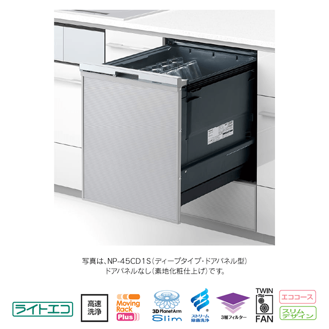 ◎当ページはNP-45CD1Sでご説明しています。機種により機能・仕様が異なります。※1:当社従来品(NP-45VD9シリーズ)との比較。※2:汚れの種類、付着状態により異なります。大きな残さいやこげつき、こびりつきは、庫内へセットする前に取り除いてください。※3:残さいフィルターは、週1回程度のお手入れをおすすめしていますが、使用状況により頻度は異なります。※4:<ストリーム除菌洗浄について>☆「乾燥」のみの設定では除菌できません。●試験機関:(一財)北里環境科学センター●対象品番:C1シリーズ●試験方法:食洗機庫内の菌液付着食器の生菌数測定(寒天平板培養法による)●試験報告書番号:C1シリーズ 北生発2025_0124号●除菌方法:加熱温水噴射方式●除菌対象:庫内食器類●試験結果:99 %以上の除菌効果(1種類のみの菌で実施)。除菌効果は食器の量や位置、汚れの程度により異なります。※5:<まな板除菌について>☆「乾燥」のみの設定では除菌できません。●試験機関:(一財)北里環境科学センター●対象品番:C1シリーズ●試験方法:食洗機庫内の菌液付着食器の生菌数測定(寒天平板培養法による)●試験報告書番号:C1シリーズ 北生発2025_0125号●除菌方法:加熱高温水噴射方式(ディープタイプは粉末洗剤8 g、ミドルタイプは粉末洗剤5 g(いずれも「高速洗浄コース」で運転))●除菌対象:庫内食器類(まな板)●試験結果:99 %以上の除菌効果(1種類のみの菌で実施)。除菌効果は食器の量や位置、汚れの程度により異なります。※6:「標準コース」・「予約コース」のみ。食器の種類・設置状態・室温・水温の変化によっては、正しくライトエコ運転しない場合があります。●消費電力量最大約25 %削減。NP-45CD1Sでの比較。●ライトエコ運転した場合:消費電力量約0.42 kWh。●ライトエコ運転しない場合:消費電力量約0.56 kWh。●日本電機工業会自主基準「食器洗い乾燥機の性能測定方法(2008年3月5日改正)に基づき、給湯温度60 ℃で測定。●これらは最大値であり、食器量により効果は異なります。◎掲載の写真、イラスト、CG合成はすべてイメージです。