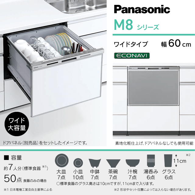 ※1:汚れの量や種類、付着の度合いなどによっては、洗浄効果を発揮できない場合があります。※2:調理器具によっては、固定できない場合があります。※3:上カゴの形状が、スライドの場合。※4:耐熱プラスチック製。※5:食器が正しくセットされていないなどで、洗浄水が当たらない部分が生じる場合があります。※6:食器の汚れ・種類・設置状態・室温・水温・水道水圧の変化によっては、正しくAIエコナビ運転しない場合があります。※7:「標準」「予約」コースのみ。※8:NP-60MS8シリーズでAIエコナビ運転した場合としない場合の比較。AIエコナビ運転した場合:使用水量約10 L、消費電力量約0.55 kWh、運転時間約91分(50 Hz)/約96分(60 Hz)。AIエコナビ運転しない場合:使用水量約12.5 L、消費電力量約0.65 kWh、運転時間約110分(50 Hz)/約115分(60 Hz) 。日本電機工業会自主基準「食器洗い乾燥機の性能測定方法(2008年3月5日改正)」に基づき、給湯温度60 ℃で設定。※掲載のCG合成、イラストはすべてイメージです。